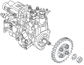 不要松開將噴油泵驅(qū)動(dòng)齒輪固定在噴油泵輪轂上的四個(gè)螺栓。不要將驅(qū)動(dòng)齒輪從輪轂上拆下來。準(zhǔn)確的噴油泵正時(shí)幾乎很難達(dá)到。僅拆下驅(qū)動(dòng)齒輪螺母和密封圈, 將輪轂留在齒輪上。