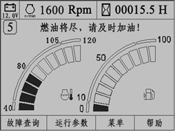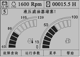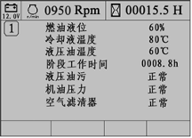 2)燃油油位;3)機(jī)油壓力;4)液壓油溫;5)轉(zhuǎn)速;6)空氣濾清堵塞;7)預(yù)熱指示;8)充電及系統(tǒng)電壓指示;9)各種工作狀態(tài)等。