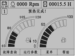 啟動開關(guān)打到預(yù)熱檔,發(fā)動機(jī)開始預(yù)熱,工作顯示界面提示“預(yù)熱進(jìn)行中!”文字提醒。保持預(yù)熱15秒后,預(yù)熱完成,工作顯示界面提示“預(yù)熱完成!”文字提醒,如圖所示。