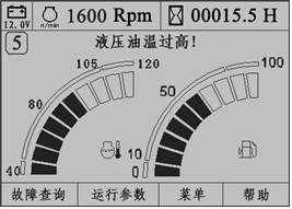 如果液壓油溫度達(dá)到85℃,約10秒鐘后,監(jiān)控儀表提示“液壓油溫過高!”文字報(bào)警,監(jiān)控儀表面板上液壓油油溫報(bào)警指示燈