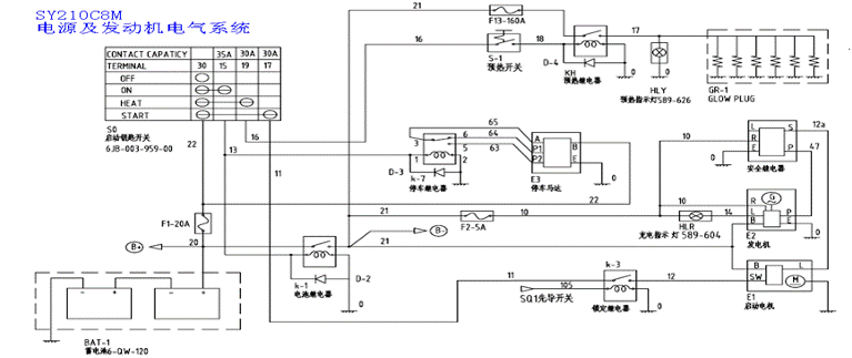 可能的原因:①啟動開關(guān)11號端子線未插好。②啟動開關(guān)損壞。③液壓操縱桿打開,④ K3損壞。⑤啟動馬達(dá)損壞,⑥ 電源繼電器損壞,