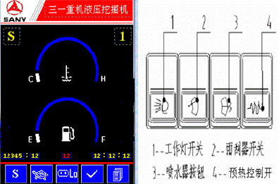 l 右操作面板黃色指示燈為發(fā)動機(jī)預(yù)熱指示燈,通過閉合位于后面的翹板開關(guān),并將點(diǎn)火開關(guān)打到ON-START之間的預(yù)熱位置,此時指示燈亮,表示開始預(yù)熱。