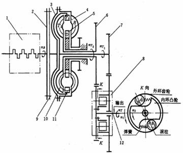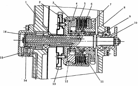 液壓離合器的離合器殼3和齒輪13用螺釘固裝在一起,齒輪13又通過內(nèi)花鍵與輸入軸連接,構(gòu)成離合器的主動(dòng)部分。離合器部分則由活塞4、主動(dòng)(外)摩擦片5、從動(dòng)(內(nèi))摩擦片6、回位彈簧11、外端蓋以及檔圈等組成。離合器中的主動(dòng)摩擦片通過外花鍵與離合器的殼體連接,從動(dòng)摩擦片則通過內(nèi)花鍵與從動(dòng)齒輪連接。從動(dòng)齒輪通過軸承支承在輸入軸上,并可相對(duì)于輸入軸轉(zhuǎn)動(dòng)。