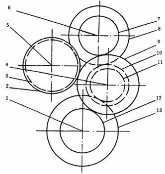 l—輸出軸 2—倒檔軸大齒輪 3—倒檔軸小齒輪 4—中間軸 5—倒檔軸 6—輸入軸 7—輸入軸I擋齒輪 8—輸入軸Ⅱ檔齒輪 9—中間軸I檔齒輪 10—中間軸Ⅱ檔齒輪 11—中間軸低檔齒輪 12—輸出軸高檔齒輪 13—輸出軸低檔齒輪BS428變速箱齒輪嚙合情況示意圖(從輸入端看)