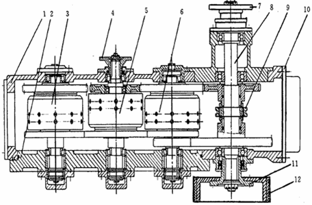 l—變速箱體、 2—大端蓋 、3—倒檔軸總成 、4—輸入軸法蘭、5—輸入軸總成 、6—中間軸總成7—后輸出法蘭 8—輸出軸 9—高低檔滑套 10—油底殼 11—前輸出法蘭 12—帶式制動(dòng)器