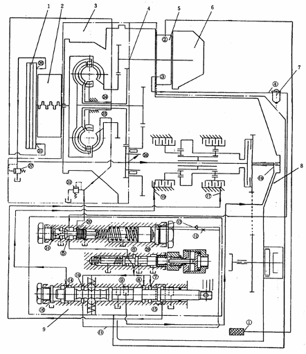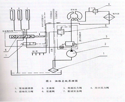 液力傳動(dòng)油經(jīng)變速泵輸出,經(jīng)濾油器過濾后供給變速操縱閥(或減壓閥)。工作油液首先進(jìn)入變速操縱閥的變速操縱油路,滿足變速要求,然后一部分油液再進(jìn)入變矩器。