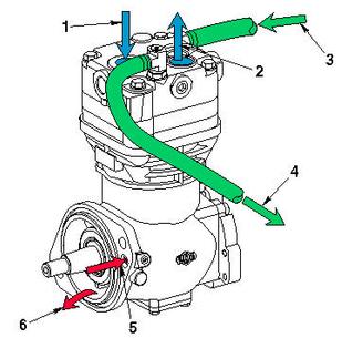 空氣壓縮機(jī)連續(xù)運(yùn)行,但有“負(fù)載”和“空載”兩種運(yùn)行模式。工作模式由壓力驅(qū)動(dòng)調(diào)壓器和壓縮機(jī)卸荷閥總成控制。當(dāng)空氣系統(tǒng)達(dá)到預(yù)定壓力時(shí),調(diào)壓器給卸荷閥總成施加一個(gè)空氣信號(hào),使得卸荷閥打開(kāi)或者關(guān)閉壓縮機(jī)進(jìn)氣門(mén),于是壓縮空氣停止流入空氣系統(tǒng)。當(dāng)使用系統(tǒng)時(shí),壓力下降。在預(yù)定壓力下,調(diào)壓器給壓縮機(jī)卸荷閥總成發(fā)出空氣信號(hào),允許壓縮機(jī)再次向空氣系統(tǒng)泵入壓縮空氣。
