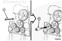 注: 用于較新的發(fā)動機上的軸上沒有使用拉拔器所需的螺紋。松開螺釘 (36),但不要全部拆下。