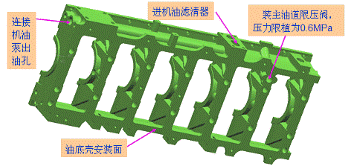 主、副油道鉆兩個(gè)斜孔,并通過主軸承孔連通,實(shí)現(xiàn)副油道供冷卻噴鉤的機(jī)油和潤滑油泵的機(jī)油。
