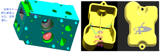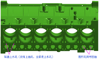 玉柴氣缸體-底面視圖:主油道通副油道的過渡由主軸承孔開槽來實(shí)現(xiàn),不必另外布置油道,結(jié)構(gòu)簡(jiǎn)單。