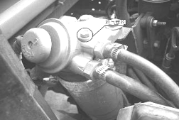 排放燃油系統(tǒng)中的空氣時(shí),應(yīng)該先旋轉(zhuǎn)燃油濾清器頂部的放氣螺塞,將其松開,按壓手油泵,直到從放氣孔中流出無空氣的燃油。緊固放氣螺塞。