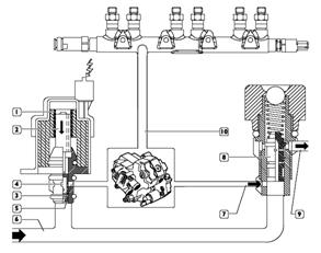 1. 進(jìn)油計(jì)量比例閥控制線圈 2. 閥芯 3. 復(fù)位彈簧 4. 柱塞閥 5. 進(jìn)油計(jì)量比例閥燃油出口6. 高壓油泵的進(jìn)油口(經(jīng)過(guò)濾清器過(guò)濾后的燃油)7. 高壓油泵的回油油道 8. 階躍回油閥的柱塞 9. 回油 10. 高壓燃油