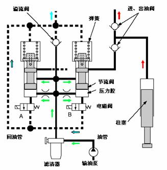 ④當(dāng)電磁閥A和B根據(jù)來(lái)自ECU的信號(hào)被賦予了電壓后,壓力腔側(cè)回油通道打開了,在壓力腔的的油從側(cè)回油通道流出。