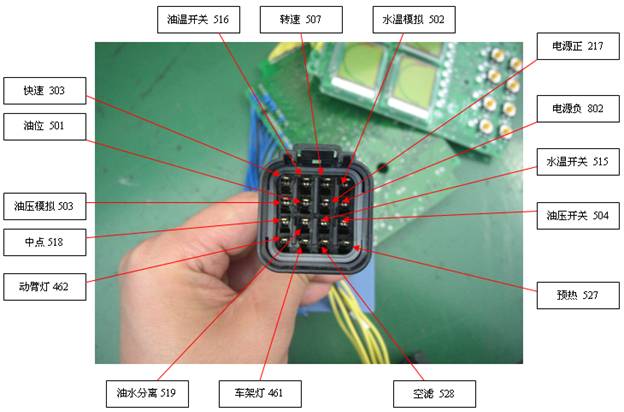 1、用一根黑線和一根黃線的一端共同連接在電源負(fù)極上,黑線另一端連接儀表護(hù)套如圖1位置(802號(hào)線),紅線一端接電源正極,另一端接儀表護(hù)套如圖1位置(217號(hào)線),打開電源,顯示如圖所示。