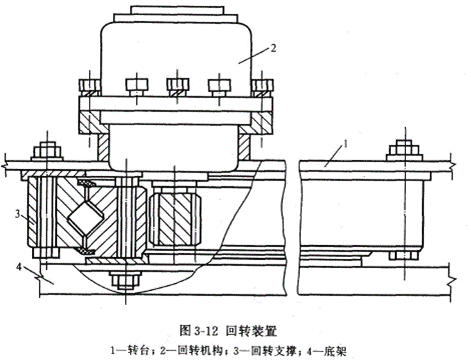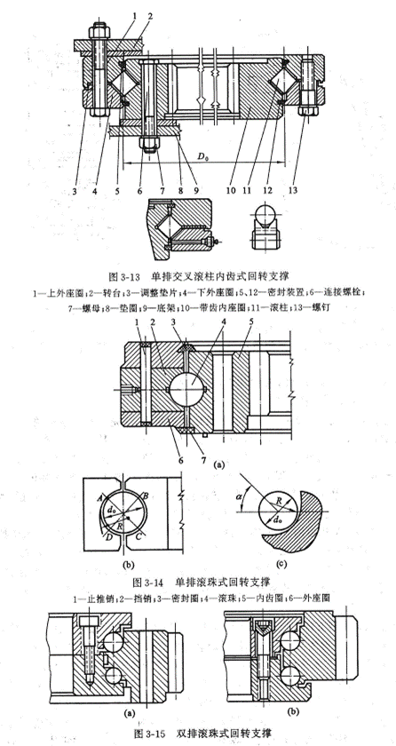 單斗液壓挖掘機(jī)用回轉(zhuǎn)支撐的結(jié)構(gòu)型式,實(shí)現(xiàn)上部平臺的回轉(zhuǎn),回轉(zhuǎn)支撐按結(jié)構(gòu)形式分為轉(zhuǎn)柱式和滾動(dòng)軸承式等兩種,見圖3-13、圖3-14、圖3-15。