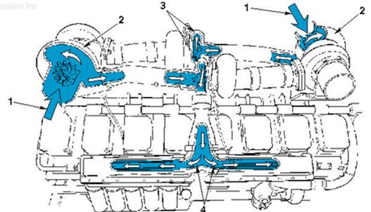 康明斯進氣系統(tǒng)包括中冷器、增壓中冷器、進氣歧管和空氣管。