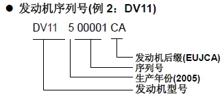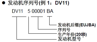發(fā)動(dòng)機(jī)型號(hào)和序列號(hào)設(shè)置在圖示位置。當(dāng)尋求必要的產(chǎn)品保證和部件訂購(gòu)時(shí),這些數(shù)字是必要的。同時(shí)通過(guò)各數(shù)字的位置也指明了發(fā)動(dòng)機(jī)的型號(hào)和系列號(hào)。