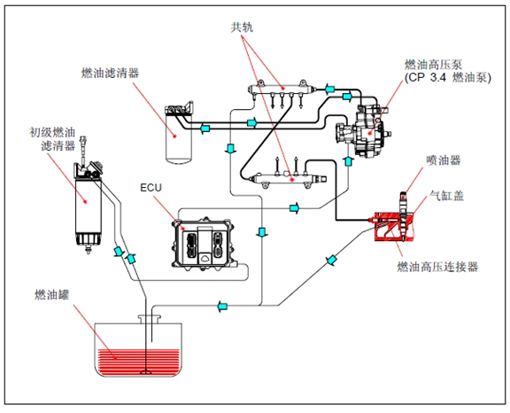 燃油在壓力下貯存到共軌噴油器中以備噴射。噴射燃油的數(shù)量由駕駛員確定,噴射