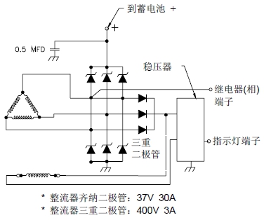 � 交流發(fā)電機裝有整體式硅整流器。一個裝在交流發(fā)電機內(nèi)部的晶體管穩(wěn)壓器,限