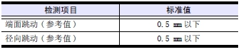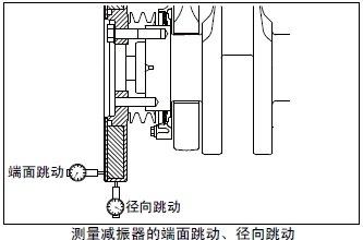 測(cè)量減振器的端面跳動(dòng)和徑向跳動(dòng)。超過(guò)標(biāo)準(zhǔn)值時(shí),檢查螺栓的緊固狀況、安裝配合面有無(wú)異物粘附等組裝狀態(tài)。