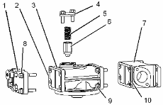 將密封墊 (10) 和接頭 (7) 安置在發(fā)動機機油濾清器底座 (3) 上,安裝螺栓 (9) 。