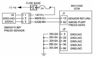 該診斷代碼與回轉(zhuǎn)泵壓力傳感器有關(guān)。 FMI 04 表示機(jī)器 ECM 已確定傳感器輸出信號電壓低于正常值。