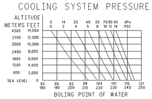 溫度和壓力協(xié)同作用。在對冷卻系統(tǒng)的故障進(jìn)行診斷時(shí),必須檢查溫度和壓力。冷卻系統(tǒng)的壓力影響冷卻系統(tǒng)溫度。例如,請參閱圖1。圖中顯示了水的沸點(diǎn)(蒸汽)和高于海平面的高度對壓力的影響。