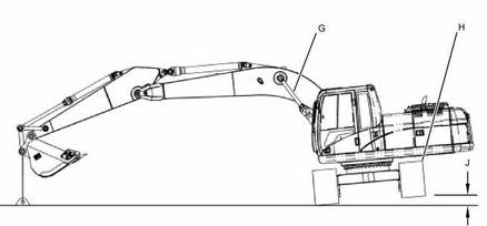 測量泵壓力時機器的位置 (G)動臂油缸的伸出部分 (H)后側或機器的履帶 (J)履帶與地面之間的空隙 |