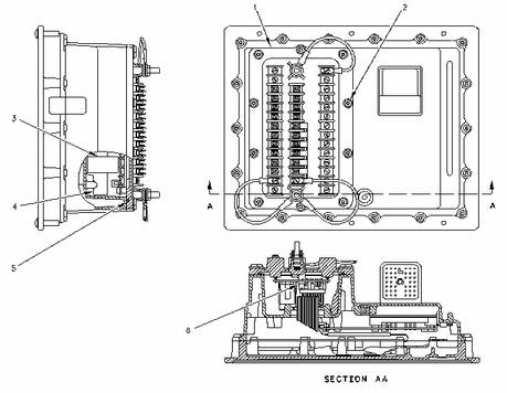 卡特彼勒柴油發(fā)電機(jī)組繼電器模塊的更換 GSC+后視圖 (1) 繼電器模塊 (2) 螺釘 (3) 膠帶 (4) 干燥劑包 (5) O 形密封圈 (6) 電纜接頭 |