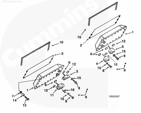 K38 和 K50 康明斯發(fā)動(dòng)機(jī)上的中冷器側(cè)蓋板已經(jīng)改變。新式蓋板上的安裝法蘭厚度為 25.4 mm [1.000 in]。舊式蓋板上的安裝法蘭厚度為 13 mm [0.5 in]。新式蓋板需要帶有鎖緊墊圈和平墊圈的 [3/8 - 16 x 2.250 in] 螺栓,以便將蓋板固定到中冷器殼體上。