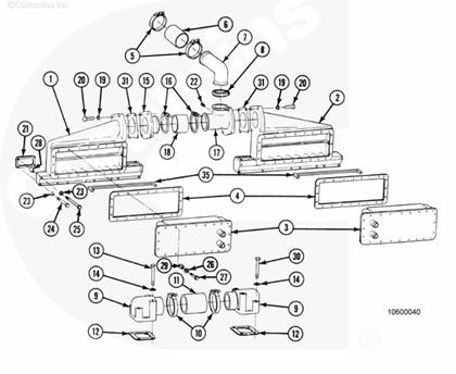 K50 康明斯發(fā)動(dòng)機(jī)的中位安裝中冷器殼體已經(jīng)經(jīng)過改進(jìn)。殼體已經(jīng)經(jīng)過改進(jìn),以便安裝十字螺栓,該螺栓能否防止由于溫度和內(nèi)部壓力造成殼體膨脹而泄漏。對殼體進(jìn)行改進(jìn)以便安裝十字螺栓的步驟包含在本手冊的這一部分中。