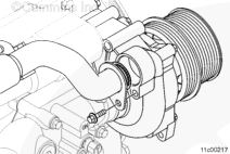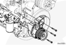 注: 要拆卸和安裝水泵,早期的、在中間鋁制皮帶張緊器惰輪支架上沒有縫槽的發(fā)動(dòng)機(jī)需要拆下減振器。