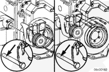 潤滑和安裝新的 O 形密封圈。安裝兩個(gè)導(dǎo)向雙頭螺栓。安裝水泵和3根螺栓。