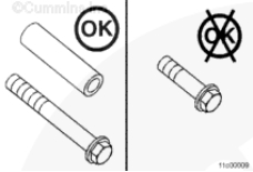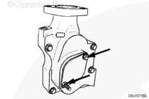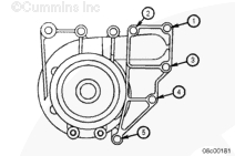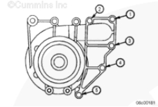 使用清潔的康明斯發(fā)動(dòng)機(jī)機(jī)油潤滑所有水泵螺栓的螺紋和螺栓端頭底部。安裝水泵和兩個(gè)下部螺栓。擰緊螺栓,將水泵固定到位。