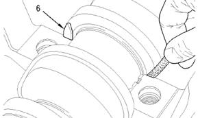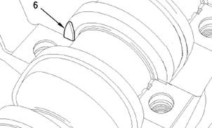 10.用清潔的發(fā)動機機油輕輕潤滑上止推墊圈(6)。將上止推墊圈(6)安裝到缸體中相應主軸承的每側。上部止推墊圈(6)中的凹槽必須抵到曲軸上。如有必要,將曲軸移至前部或后部,以安裝止推墊圈(6)。