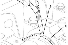 11.用清潔的發(fā)動機機油輕輕潤滑下止推墊圈(5)。將下止推墊圈(5)安裝到相應主軸承蓋的每側。下部止推墊圈(5)中的凹槽必須抵到曲軸上。