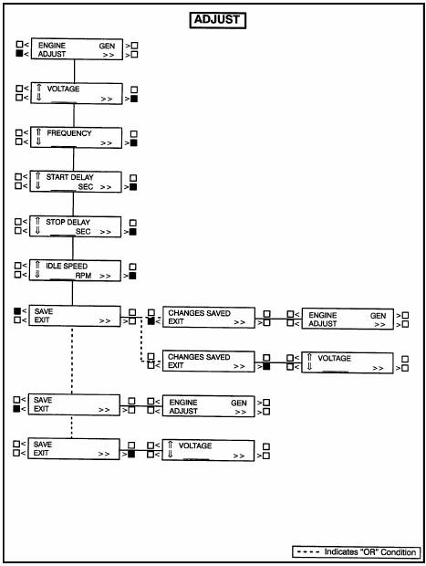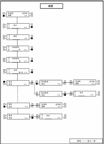 調(diào)整(ADJUST)子功能允許對發(fā)電機組輸出電壓、頻率、起動和停機延時進行調(diào)整。