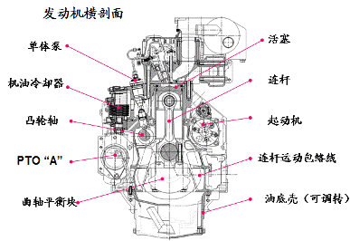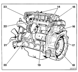 14 升降點,15曲軸箱呼吸閥,16 調(diào)速器,17 SAE護蓋,18調(diào)速輪,19 啟動馬達,20 廢氣渦輪增壓器,21鼓風機,22 排氣總管,23進氣口總管,