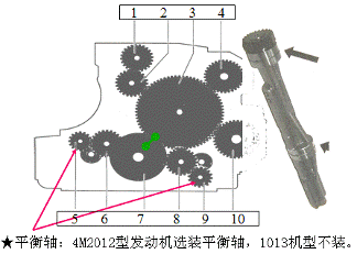 1.調(diào)速器驅(qū)動(dòng)齒輪,2.惰輪,3.凸輪軸齒輪,4.液壓泵齒輪,5.平衡軸齒輪,6.惰輪,7.曲軸齒輪,8.惰輪,9.平衡軸齒輪,10.壓縮機(jī)齒輪,