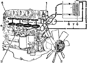 1.節(jié)溫器室,2.冷卻液泵,3.機(jī)油散熱器,4.氣缸的冷卻,5.缸蓋的冷卻,6.散熱器,7.節(jié)溫器到補(bǔ)液箱的回路,8.補(bǔ)液箱到節(jié)溫器的回路