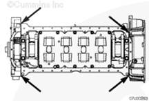 在康明斯ISX15 CM2250發(fā)動機前齒輪室與飛輪殼體密封墊與油底殼密封墊相交處的四個 T 形接頭上都涂上一道寬度為 1.97 mm [1/8 in] 的硅脂密封膠(零件號 3164067)。