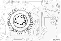 注: 遵循上述可調(diào)惰輪安裝步驟,確保擋板和軸中的油孔與缸蓋中的油道對準。使用凸輪軸惰輪座圈標記在正確的輪齒嚙合處插入塞尺。三角形代表惰輪輪齒。線條代表塞尺位置。